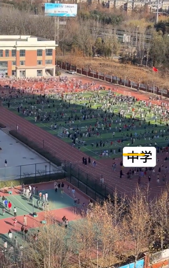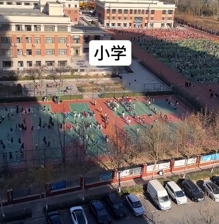 看起来真的是喜气洋洋,一片喜人之态,再一转头,这位家长就拍了临近的小学操场,小学操场本身就在面积方面更弱一筹,但是看样子也是跑满了学生。